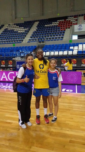 A eso de las 18:30 llegó la expedición del Teide, y venían cargados de bocadillos, por lo que merendamos tranquilamente antes del partido. Poco tuvo de especial el partido, más que ver la calidad del juego de las canarias que parecen de otra galaxia comparadas con el resto de los equipos. Al menos sirvió para que nuestras chicas se hiciesen fotos con alguna componente del equipo canario. Ni que decir tiene que la más buscada fue Iris, que verdaderamente se portó como una profesional rodeada de sus fans, aunque en esta ocasión eran jugadoras de su misma edad.